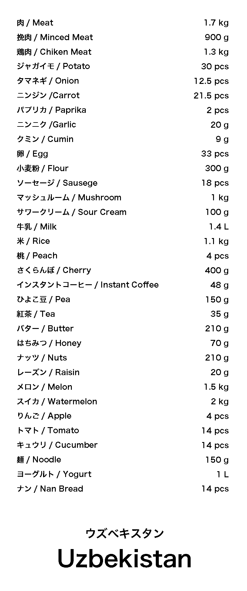 ウズベキスタンは古くはシルクロードの要所で、文化が入り混じった豊かな食文化が発達しました。ウズベキスタン料理は周辺の国にも影響を与えています。ウズベキスタンの一番の主食は小麦で、パン、麺、生地に成型して食されています。次に食べられているのは米で、特に祝い飯であるプロフは、シルクロードを伝って広い地域で食べられています。近年は健康志向から米の消費が進んだ結果、プロフの消費も増えているそうです。レポートいただいたハサノフさんはプロフが好物で、普段の食卓にも欠かせません。