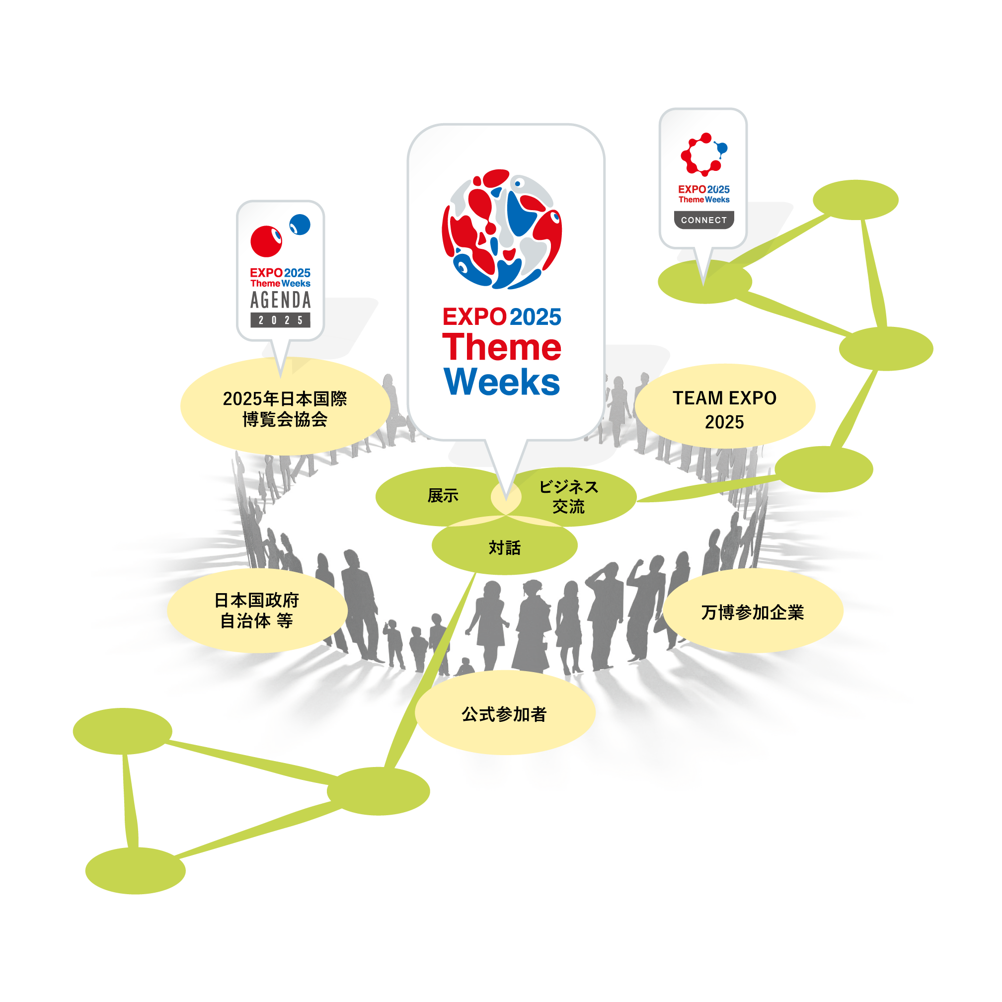 「テーマウィークコネクト」とは、万博会場外で開催される、テーマウィークの「8つのテーマ」に関連した地球的規模の課題解決に向けた取り組みです。テーマウィークの会場外関連プログラムとして、大阪・関西エリアに限定せず、全国各地で開催されます。