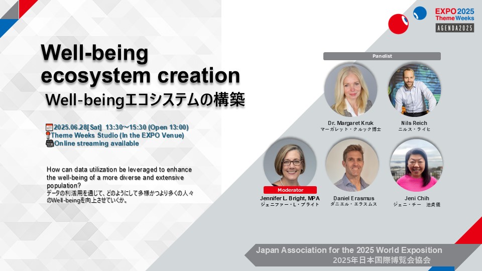 本プログラム「Well-beingエコシステムの構築」は、2025年6月28日、大阪・関西万博のテーマウィーク「健康とウェルビーイングウィーク」におけるアジェンダ2025主催プログラムとして開催された。世界各国の専門家、企業、学術機関、医療保険者など多様なステークホルダーが集結し、「データ活用によって多様で広範な人々のWell-beingをいかに高めるか?」という問いに対し議論を展開した。
