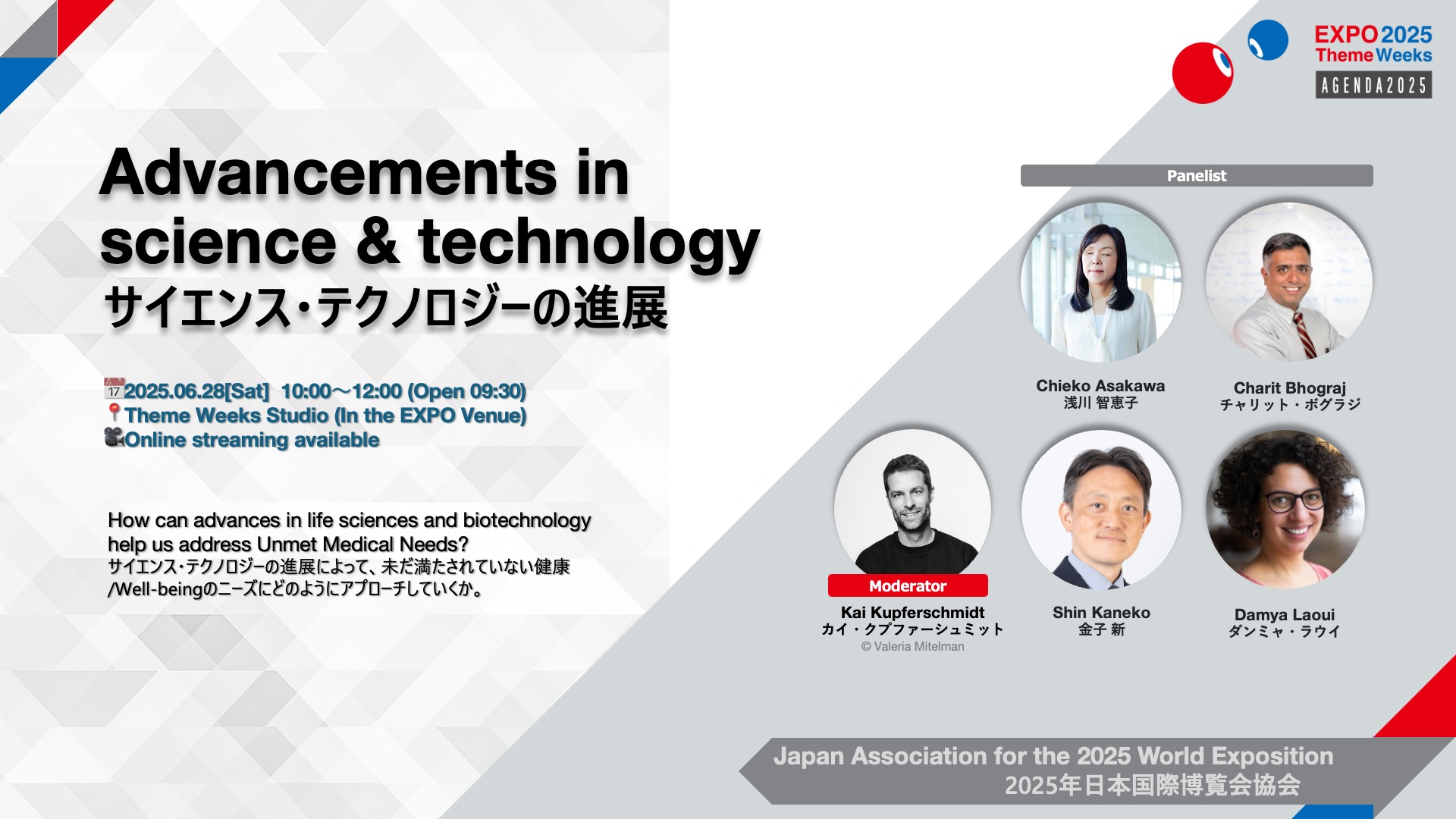 本プログラムは、テーマウィーク全体協賛者と連携して博覧会協会が企画・実施する「アジェンダ2025」の一つです。「サイエンス・テクノロジーの進展によって、未だ満たされていない健康/Well-beingのニーズにどのようにアプローチしていくか」というセントラルクエスチョンを中心に、トークセッションが展開されます。