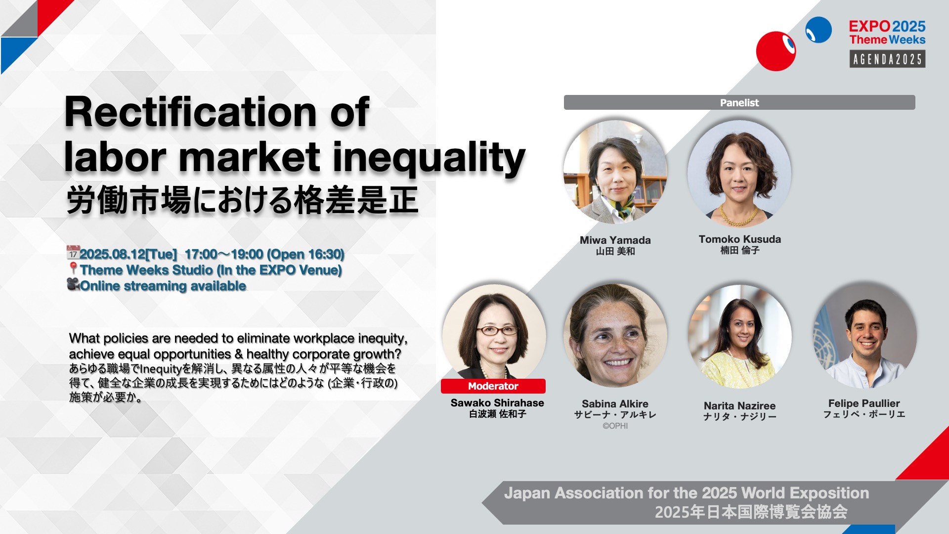 本プログラムは、テーマウィーク全体協賛者と連携して博覧会協会が企画・実施する「アジェンダ2025」の一つです。「あらゆる職場でInequityを解消し、異なる属性の人々が平等な機会を得て、健全な企業の成長を実現するためにはどのような (企業・行政の) 施策が必要か」というセントラルクエスチョンを中心に、トークセッションが展開されます。