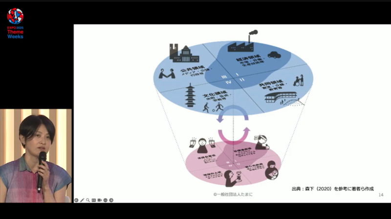 冒頭、報告書の内容紹介として、四次元相関の枠組みを用いて、現代社会における経済領域(Ⅰ次元)の極端な肥大化と他領域の萎縮という構造的問題を可視化し、加速社会における「スロー」の意義について多角的な議論を展開しました。テクノロジーや産業の進化を止めたいわけではありません。むしろ、望ましい変化や進化は歓迎したいのですが、同時に、経済領域の成長の最大化に最適化された社会は目指すべきではないと、私たちは考えています。人が人として尊重される社会、いわば、個人と社会のウェルビーイングに対して最適化された未来の実現を目指すことが重要です。