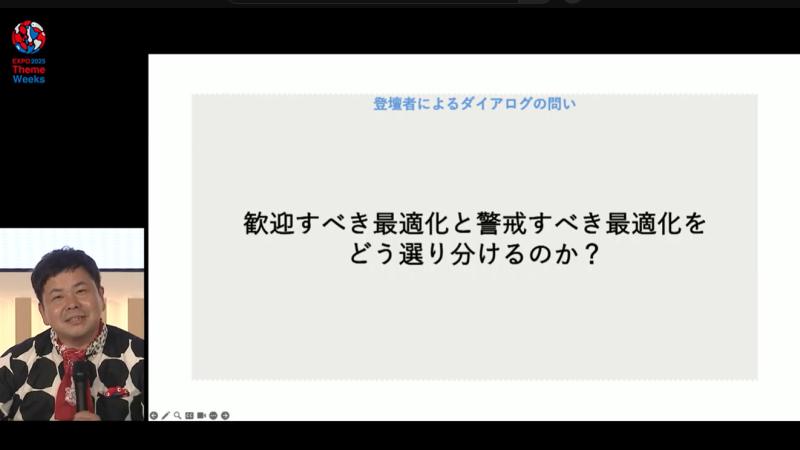 上述の報告書の骨子を踏まえ、「加速するテクノロジーの進化についていかなければならない(他に選択肢はない)」という思い込みや、「スマート化や最適化は常になされるべきよいものである」という固定観念に対して、一定の距離を持って捉えるための視点を参加者に提示できたことも、本セッションの大きな成果と言えるでしょう。