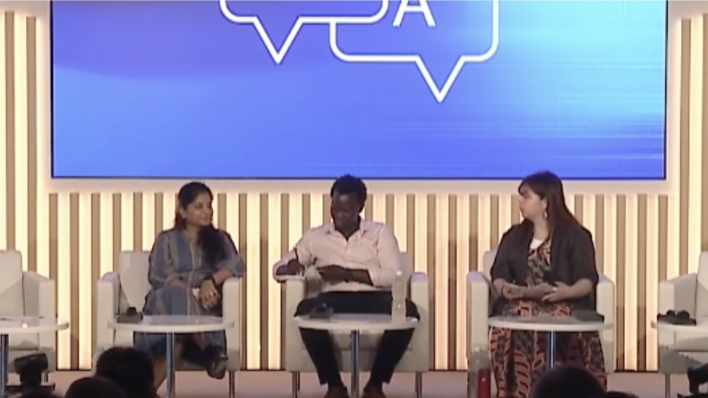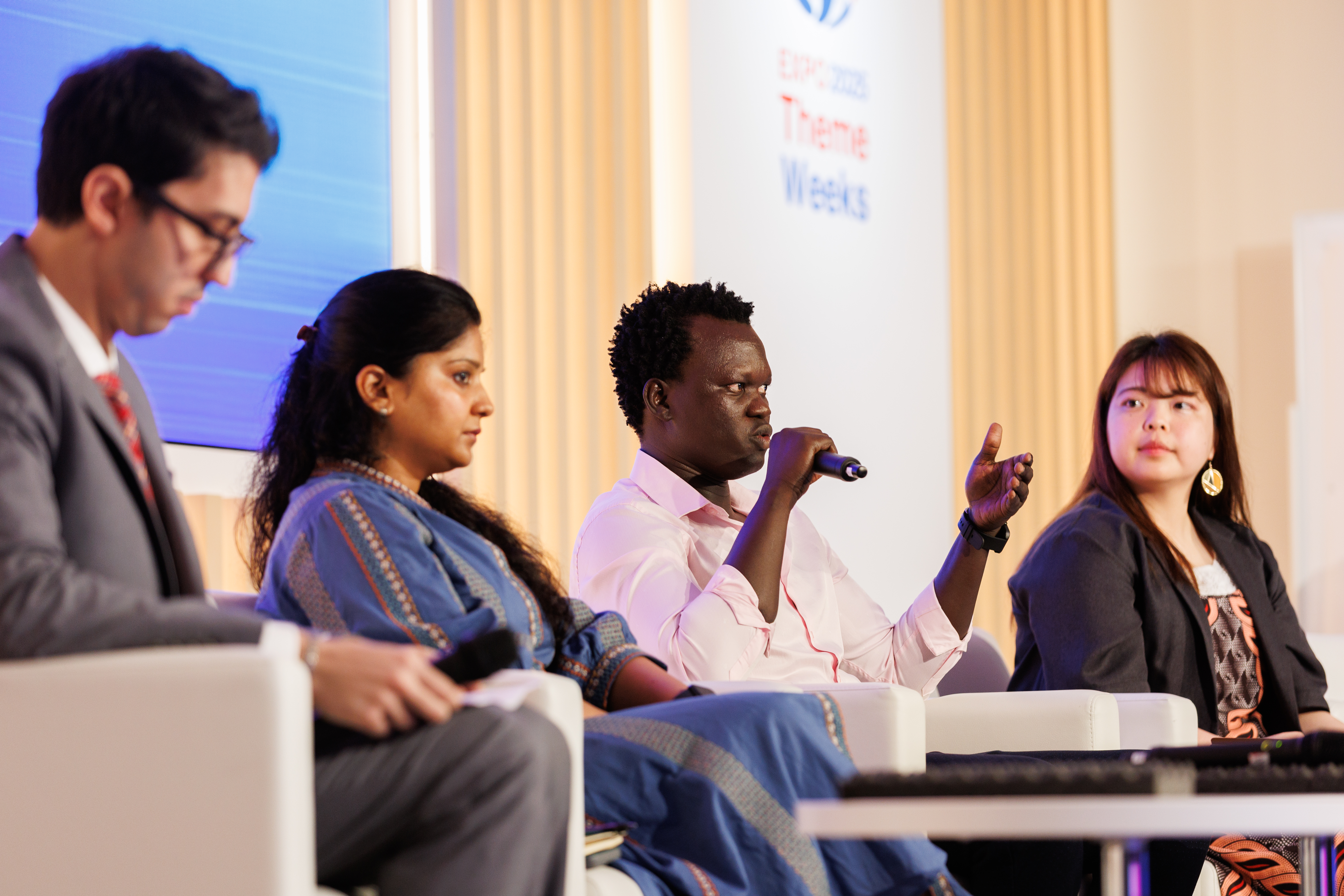 ENJINの概念を起点にしたパネルディスカッションです。国際若手平和構築ネットワーク(UNOY)のサウムヤ・アガラワル氏は、紛争から逃れた若者の支援経験から「異なる背景をもつ人を理解し、人として向き合うことが感情を平和の力に変える鍵です」と語りました。ケニアにあるカクマ難民キャンプで育ったグローバル・シェイパーズカクマハブのデング・ダク・マルアル氏は、「日本で不要になったパソコンの提供や、若者を支えるメンターの存在が大きな力になります」と述べました。
