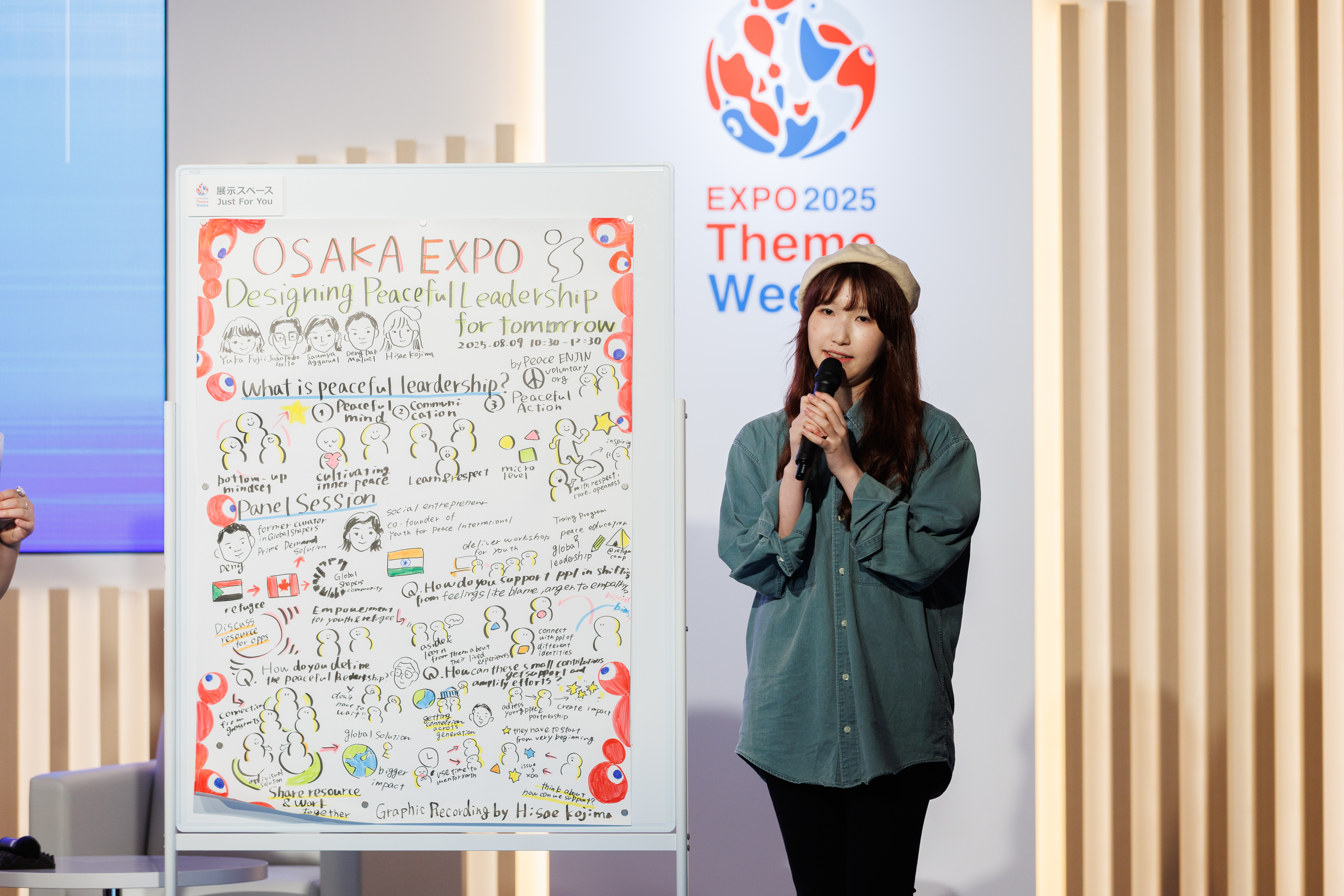 司会は、グローバル・シェイパーズ横浜ハブで難民の雇用創出に取り組む藤井優花氏と、大阪ハブのジョアン・ペドロ・グリロ氏が務めました。また、セッションの内容は横浜ハブの小島久枝氏によってグラフィックレコーディングとして可視化されました。