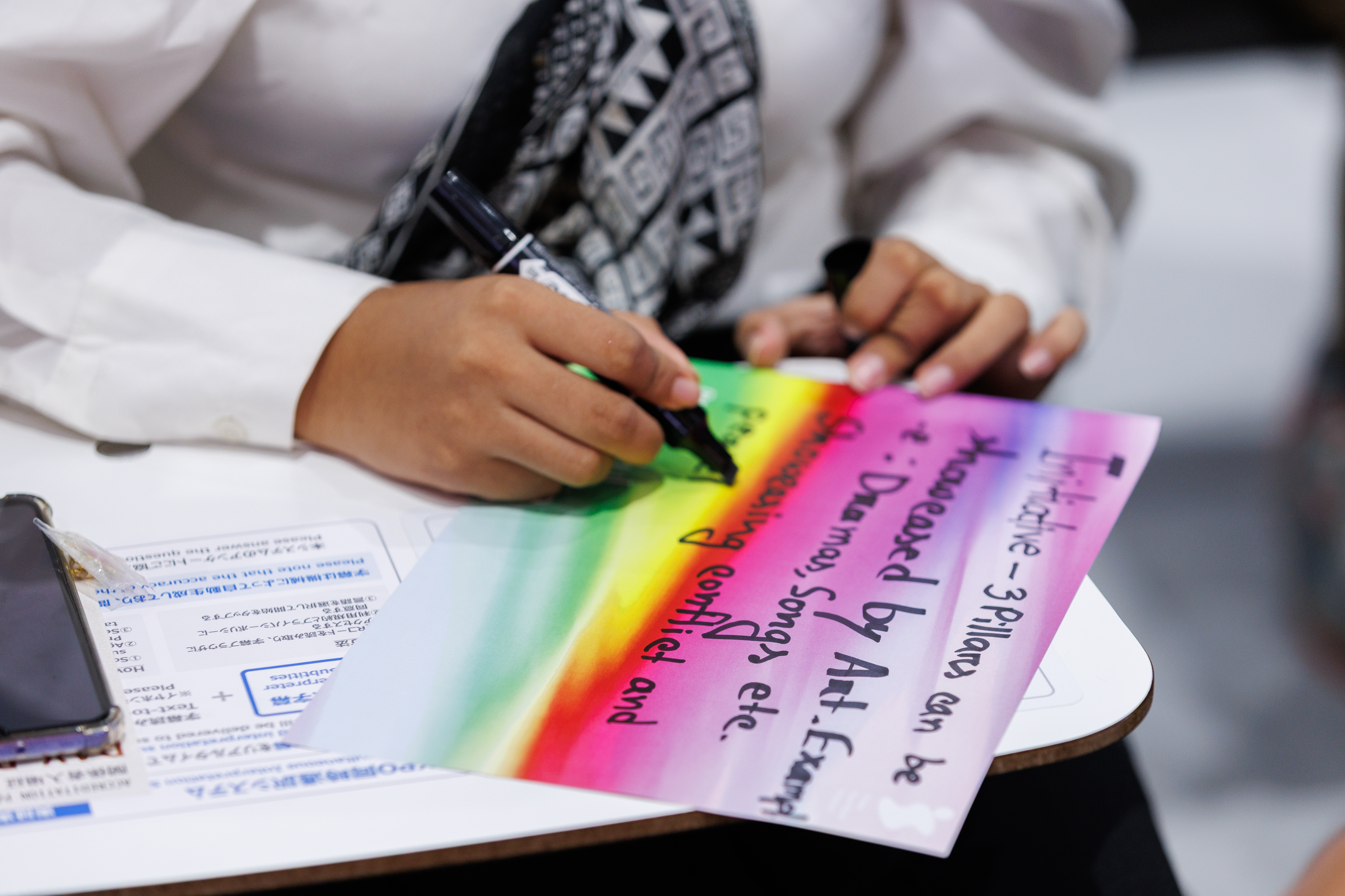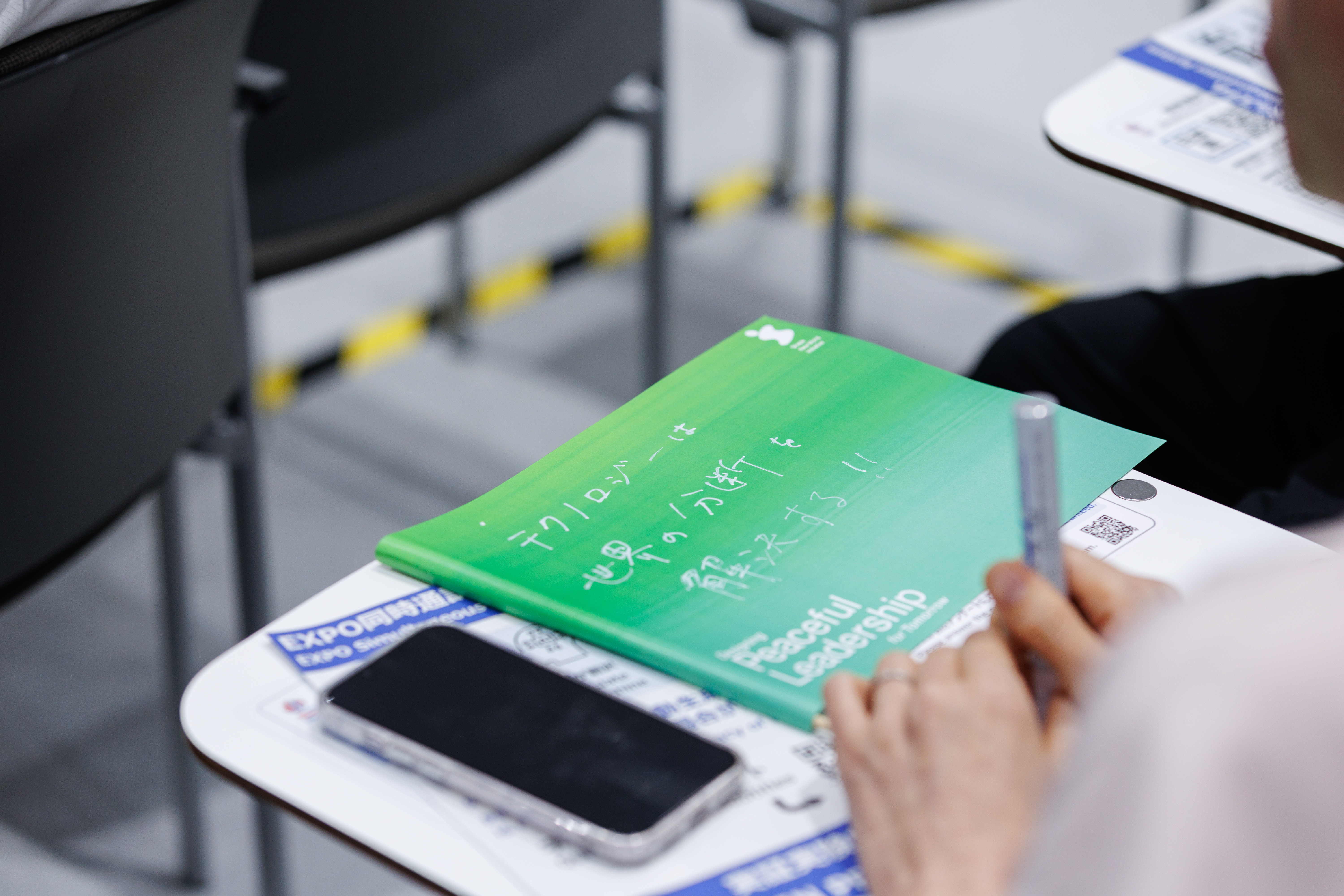 後半は参加型のワークショップが行われ、「あなたはどのようなピースフルリーダーシップを宣言し、体現したいですか?」という問いを軸に対話が進められました。参加者は「自分にとっての平和とは何か」「最も平和を感じた瞬間はいつか」を語り合い、「テクノロジーで分断をなくす」「まず人を信じてみる」「対話を増やす」などの行動宣言が生まれました。