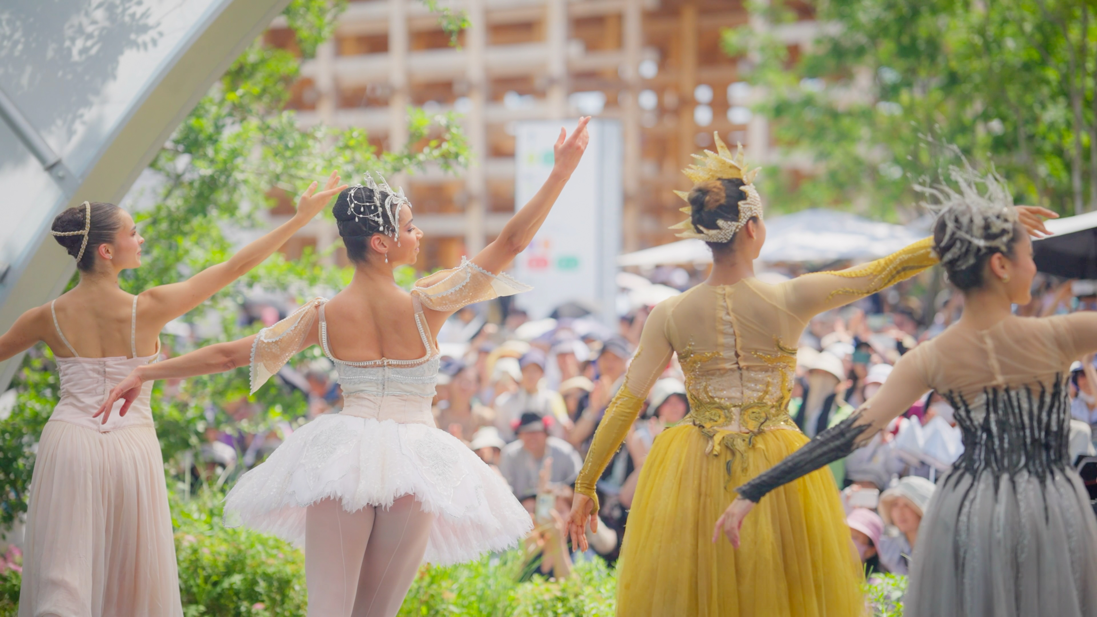 大阪・関西万博2025では、バーミンガム・ロイヤル・バレエとの協働プログラムを展開しました。ポップアップステージイースト東でのパフォーマンスは、朝から列を作る方も見られ、約500名が集まる大盛況となりました。6月の暑い日にもかかわらず、ダンサーたちは「シンデレラ」「眠れる森の美女」「ラ・マル・ガルデ」を力強く披露し、観客を魅了しました。