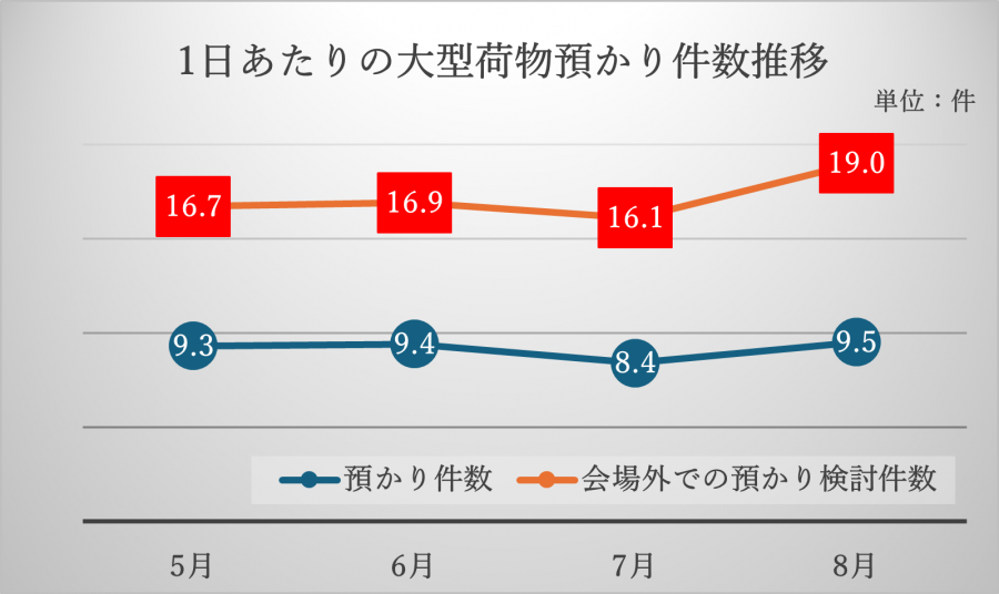 ▽会場大型荷物預かり件数と会場外での大型荷物の預かりを検討した件数の比較