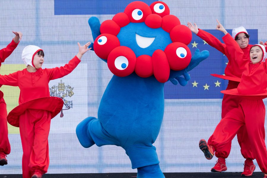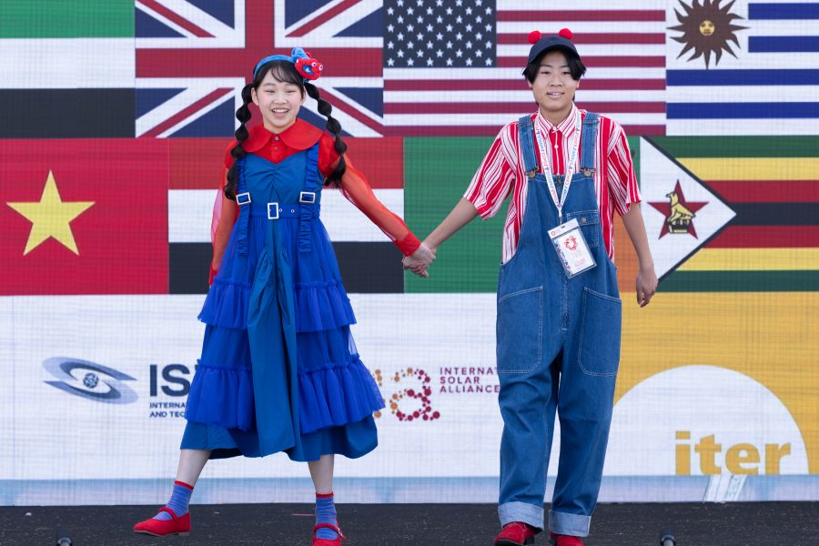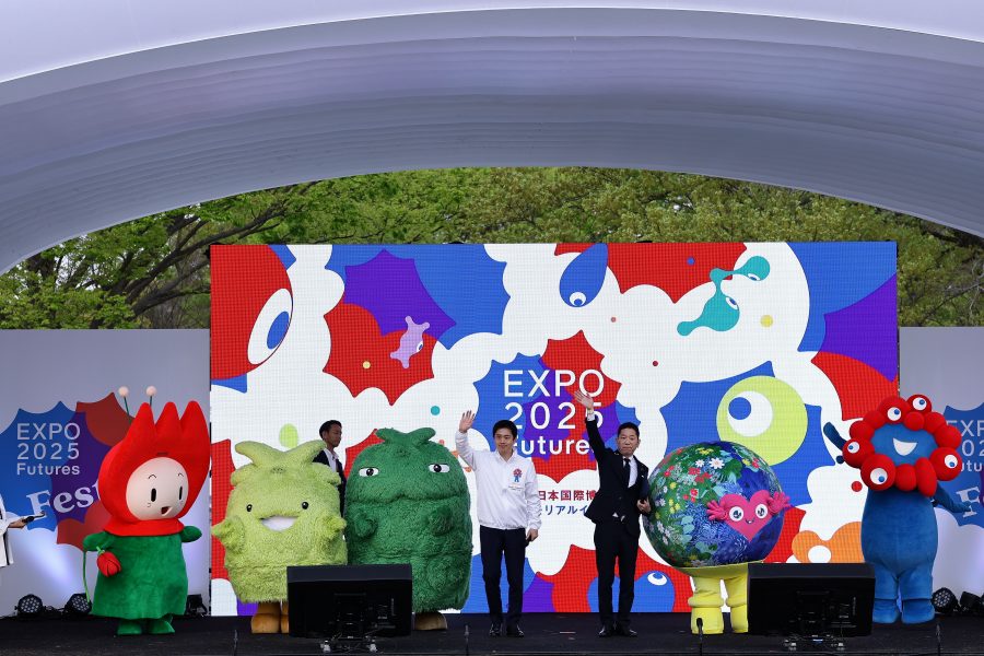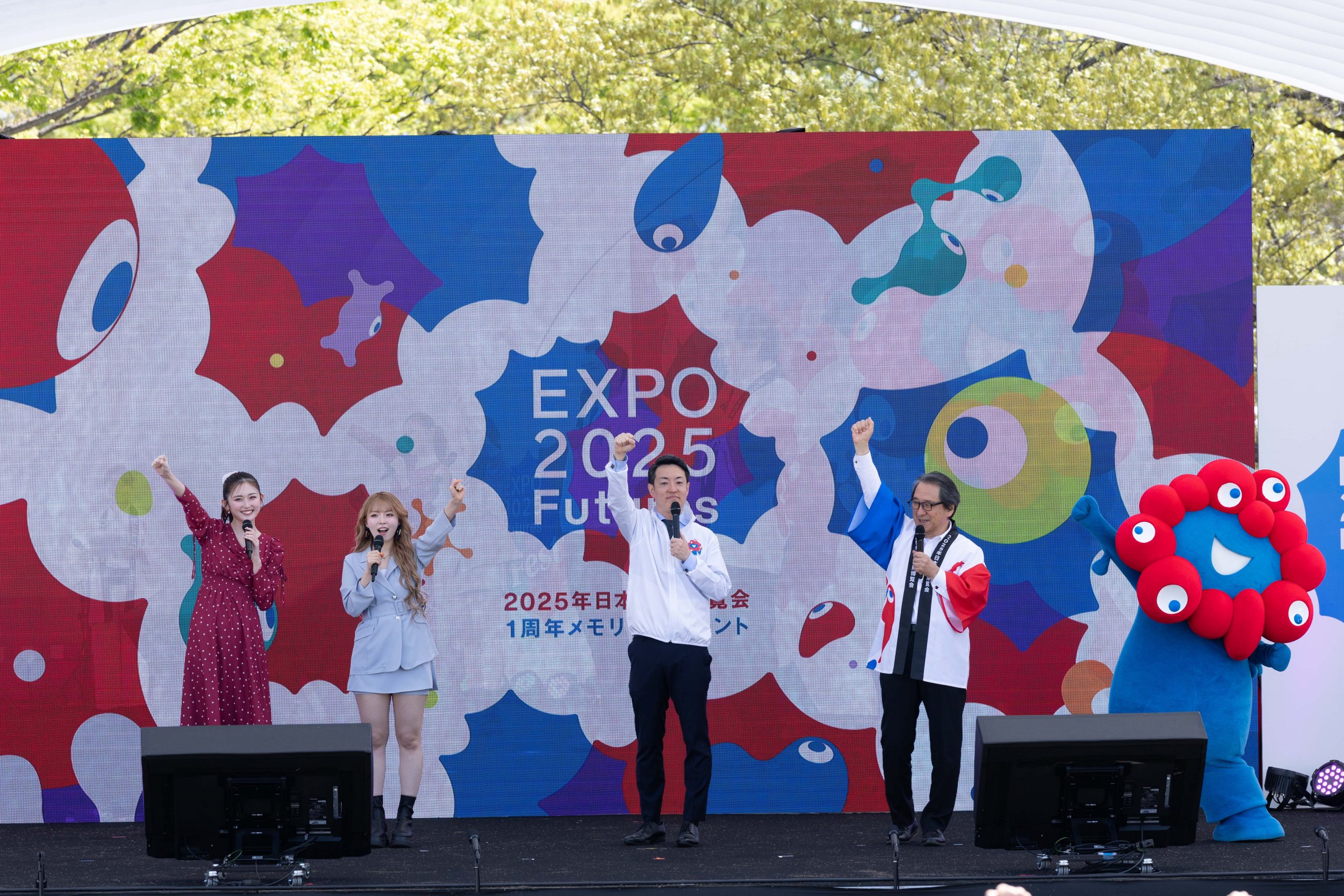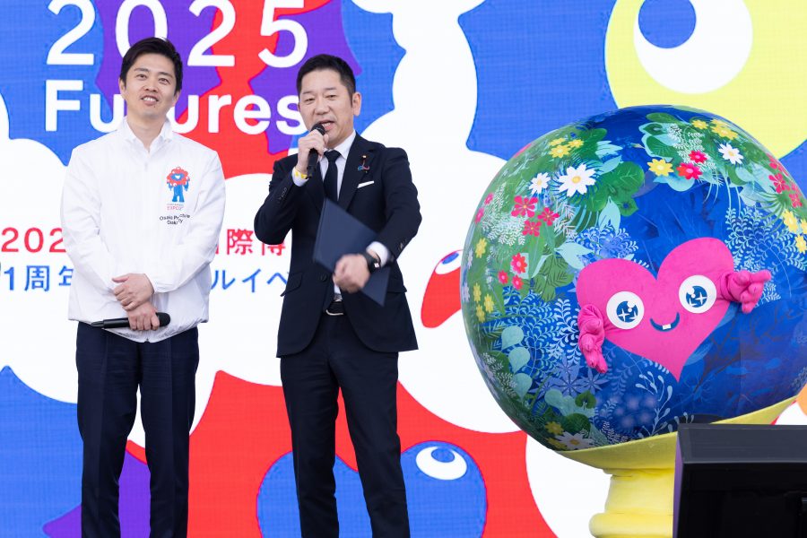 最後には越智俊之経済産業大臣政務官と吉村洋文大阪府知事が駆け付け、歴代博覧会のキャラクターである花の万博の花ずきん、愛・地球博のモリゾー&キッコロ、GREEN×EXPO 2027のトゥンクトゥンク、ミャクミャクとともに登場しました。