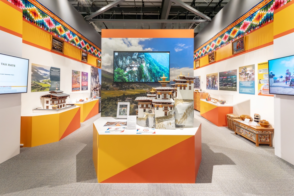 ヒマラヤ山脈の南麓に位置し、国民の幸福度を示す「国民総幸福(GNH)」に基づいて国政が行われていることで知られます。パビリオン内の「ハッピーフューチャー」ゾーンでは生活や文化、伝統「良いガバナンス」ゾーンでは医療施設や教育、王室について紹介。また、「持続可能な社会経済的発展」ゾーンでは幸せと物質主義からの解放「文化の保存と促進」ゾーンでは仏教「環境保護」ゾーンでは生物多様性の象徴であるユキヒョウや国獣のターキンなどが紹介されます。