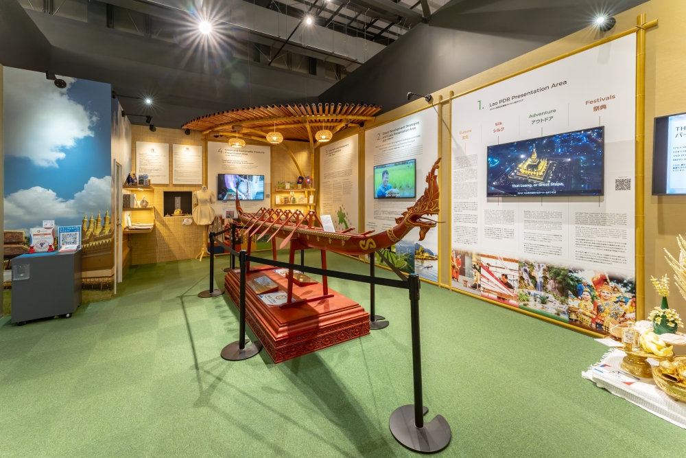 東南アジアの内陸に位置し、面積は日本の本州とほぼ同じで、国土の大部分は山岳地帯です。就業人口の約60%が農業に従事し、近年、経済的に発展しつつあります。50の民族と言語があり、多様性に富んだ文化が特徴です。パビリオンでは、ダムの模型やビデオ映像、伝統的な手工芸品や衣装の展示を通して、文化や持続可能な成長について知ることができます。また、儀式の時に使用される「Pa Khuan」と呼ばれる展示品を用いて、実際にラオスの伝統的な儀式も行われます。