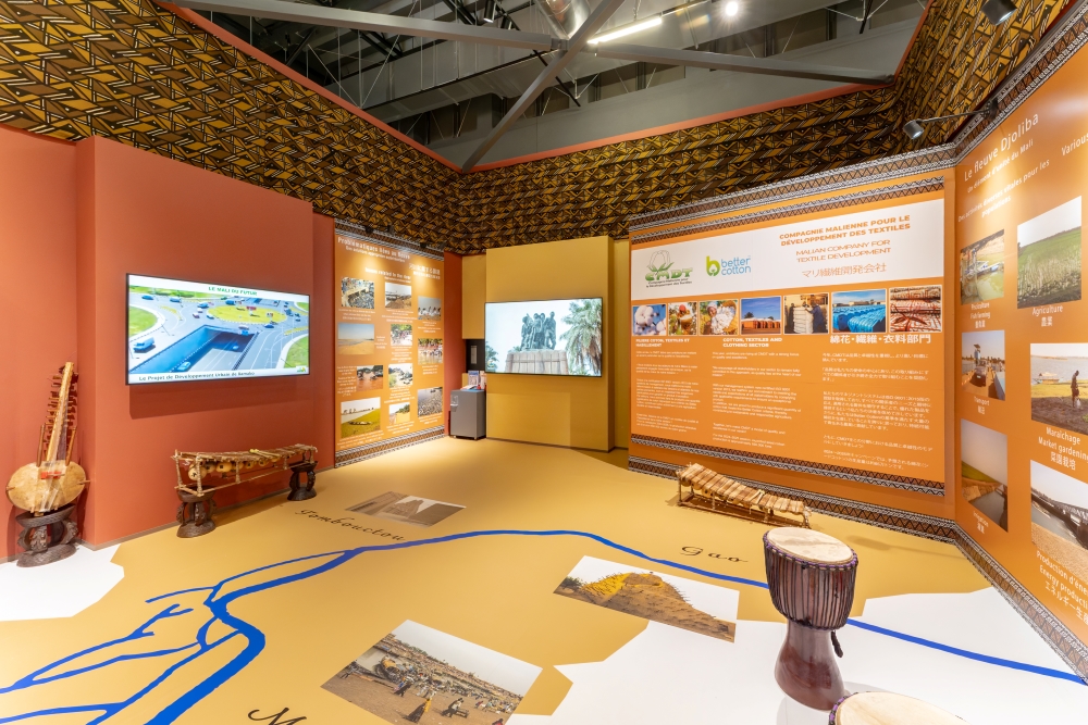 西アフリカのサハラ砂漠の南に位置し、国土の約6割は砂漠で、国内をニジェール川が流れます。サハラ砂漠の交易の中心地だったことから多くの国々が興亡した歴史を持ち、14世紀のマリ帝国の時代には「黄金の王国」とも呼ばれて世界に名を馳せました。現在でも金が最大の輸出品です。パビリオンでは、国民の生活を豊かにする未来社会を見据えた投資プロジェクトの紹介をはじめ、地理、美術工芸品、農産物など、さまざまな視点からマリの魅力が紹介されます。