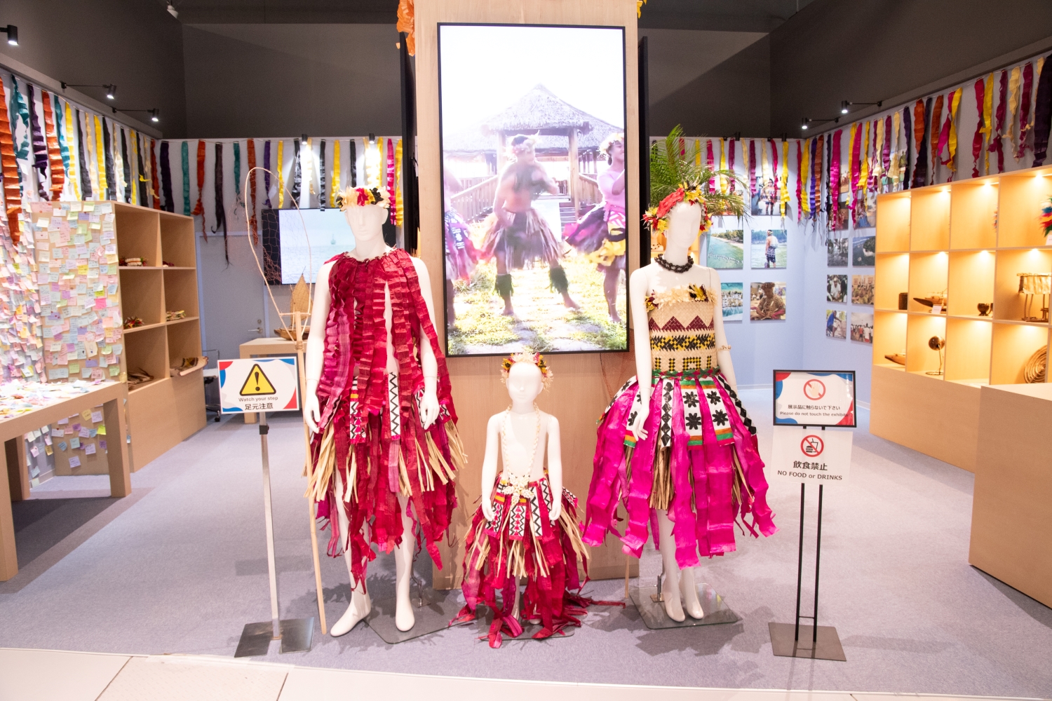 オセアニアにある、サンゴ礁に砂が堆積してできた9つの環礁で形成される国です。美しい海と手つかずの自然が残る観光名所でもあります。海抜は最大でも5mほどで、「温暖化で沈む国」ともいわれます。人が居住する9つの島には個々の文化が息づき、パビリオンでは各文化や伝統工芸、ミニチュアカヌーなどを映像や写真で紹介します。