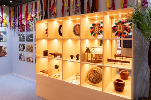 オセアニアにある、サンゴ礁に砂が堆積してできた9つの環礁で形成される国です。美しい海と手つかずの自然が残る観光名所でもあります。海抜は最大でも5mほどで、「温暖化で沈む国」ともいわれます。人が居住する9つの島には個々の文化が息づき、パビリオンでは各文化や伝統工芸、ミニチュアカヌーなどを映像や写真で紹介します。