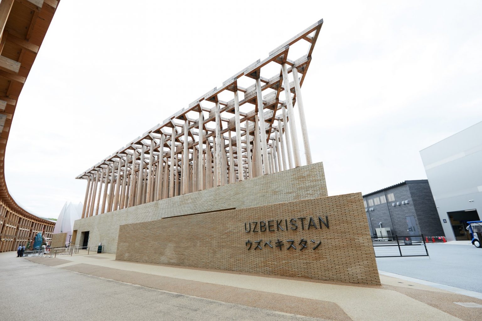 大屋根リングのすぐそばで、木製の柱が並ぶ美しい外観が目を引くウズベキスタンパビリオン。柱の切り方や並び方によって生まれる幾何学模様が、見た目にも印象的です。