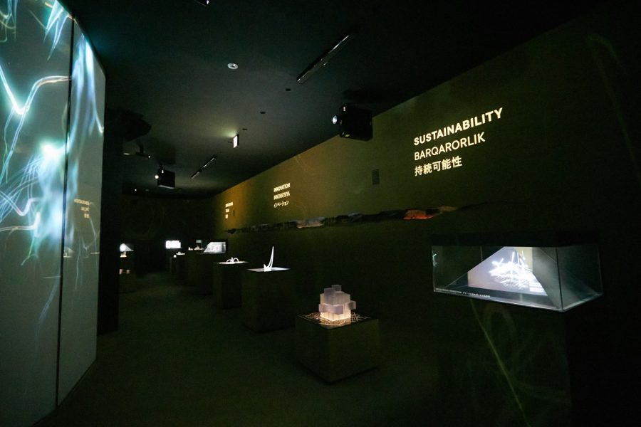 その先の展示空間には、すでに芽吹きはじめているウズベキスタンのさまざまなアイデアやプロジェクトが紹介されています。光る台座には、持続可能性、イノベーション、教育など、現在の取り組みと未来の目標がわかりやすく展示されています。
