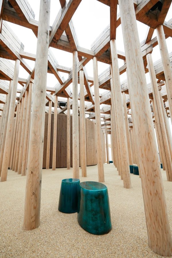 映像体験のあとは、屋上の“木の庭”へ。日本の杉の木でできた柱が並ぶこの空間では、それぞれの柱にあるQRコードをスキャンすると、柱の木材がどの地域から来たかなどの情報を知ることができます。